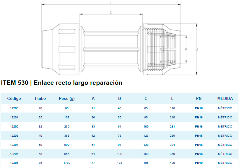 Enlace recto largo especialmente diseñado para reparaciones. Sin tope interior, es ideal como manguito pasante en reparaciones de tuberías de polietileno.