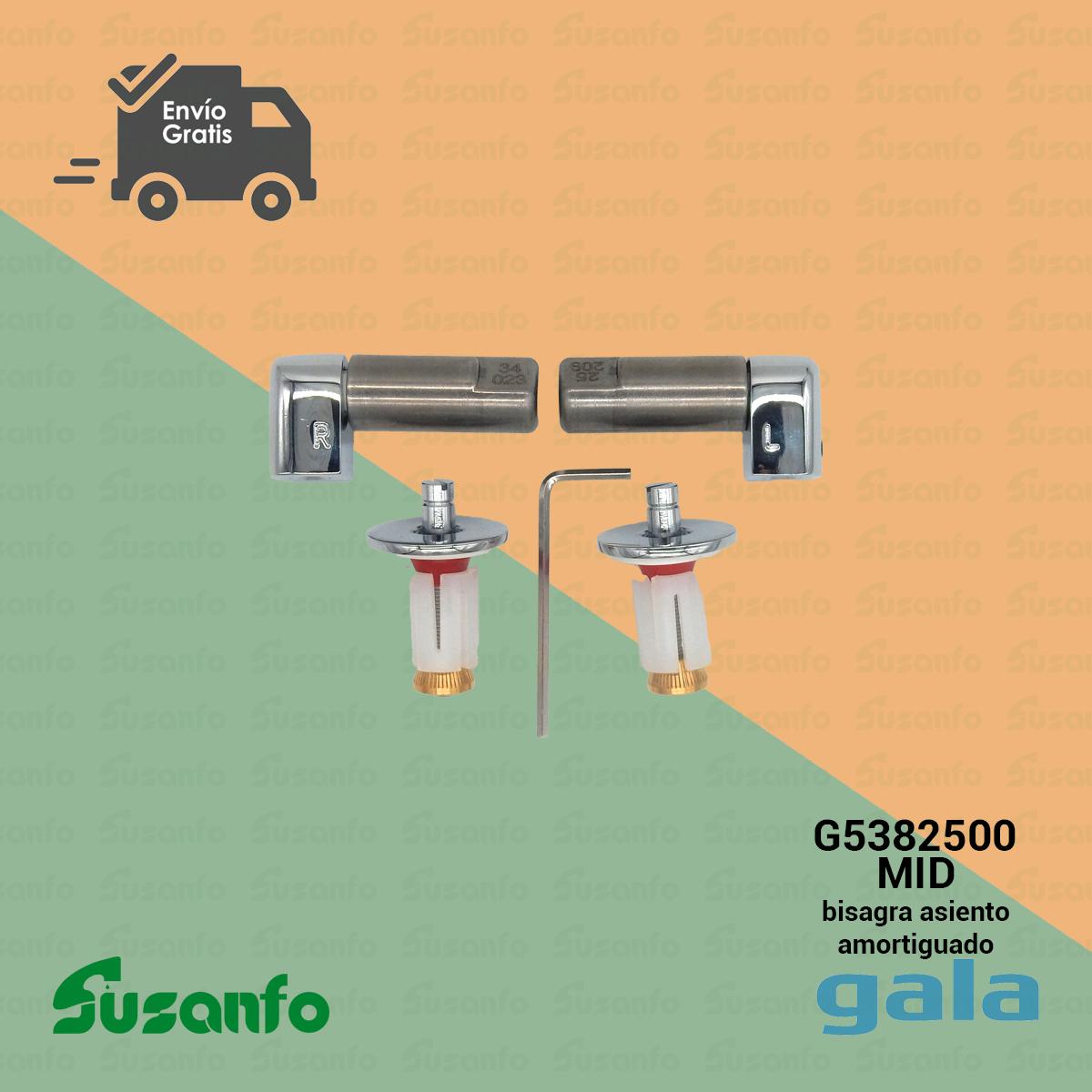 El conjunto de bisagras completas Gala MID amortiguado (ref. G5382500) es el recambio original diseñado para sustituir las bisagras del asiento cuando presentan holguras, ruidos o ya no amortiguan correctamente el cierre.